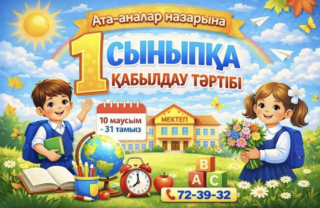 Құрметті болашақ бірінші сынып оқушыларының ата-аналары! 2026–2027 оқу жылына 1-сыныпқа құжат қабылдау Ақмола облысы бойынша 2026 жылғы 10 маусым мен 31 тамыз аралығында жүзеге асырылады. Өтінішті eGov.kz порталы арқылы онлайн тапсырылады. 1-сыныпқа жасы 6-ға толған және ағымдағы күнтізбелік жылы 6 жасқа толатын балалар қабылданады. eGov.kz порталы арқылы өтініш берген кезде мыналарды дайындау қажет: — ата-ананың немесе заңды өкілдің өтініші; — баланың 3×4 көлеміндегі цифрлық фотосуреті; — №065/у “Профилактикалық егу картасы”; — №052-2/у “Бала денсаулығы паспорты”. Ата-аналарға баламен алдын ала медициналық тексеруден өтіп, ЭЦҚ-ның жарамдылығын тексеріп, құжат тапсыруды соңғы күндерге қалдырмау ұсынылады. .